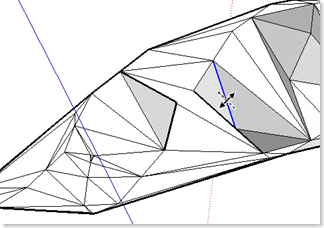 TIN (不定形三角網) 内の隣り合った三角形の一辺を90度回転し、他の三角形の頂点に接続する。ヘルプでは「トライアンギュレーションを手動で調整」と言う言葉を使っている。 TINを分解後、Sandbox/Flip Edgeを選択し、一辺をクリック 赤線の位置に変更になった。 トライアンギュレーション:互いに反対方向を向いた三角形