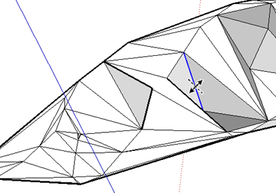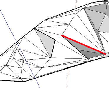 TIN (不定形三角網) 内の隣り合った三角形の一辺を90度回転し、他の三角形の頂点に接続する。ヘルプでは「トライアンギュレーションを手動で調整」と言う言葉を使っている。 TINを分解後、Sandbox/Flip Edgeを選択し、一辺をクリック 赤線の位置に変更になった。 トライアンギュレーション:互いに反対方向を向いた三角形